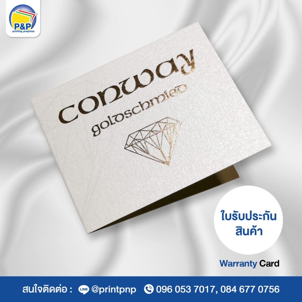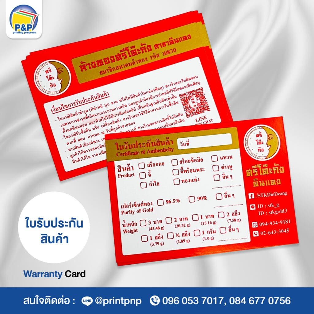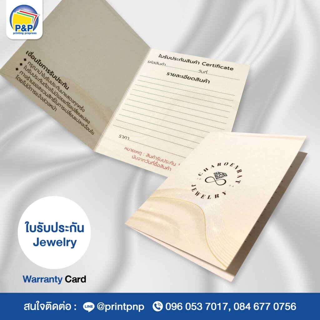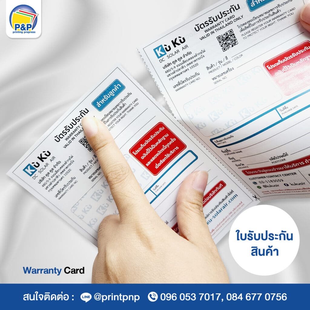 ที่ P&P Printing Prepress เราเชี่ยวชาญในการออกแบบและพิมพ์ ใบรับประกันสินค้า สำหรับทุกประเภทธุรกิจ ไม่ว่าจะเป็นสินค้าอิเล็กทรอนิกส์ เครื่องใช้ไฟฟ้า เฟอร์นิเจอร์ หรือผลิตภัณฑ์เสริมความงาม โดยใบรับประกันที่เราผลิตจะช่วยเพิ่มความน่าเชื่อถือให้กับแบรนด์ พร้อมทั้งสร้างความมั่นใจให้กับลูกค้าของคุณ